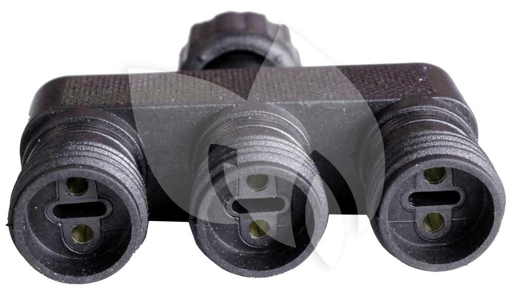 Deze waterdichte 3-weg verdeler voor 12 volt verlichtingsystemen is ideaal te gebruiken bij waterornamenten. Sluit led of halogeen verlichting aan op deze 3-weg stroomverdeler.