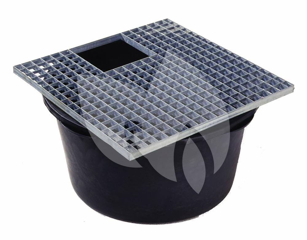 Het metalen afdekrooster is gemaakt van gegalvaniseerd staal in een vierkante vorm. Met het juiste bassin komt het afdekrooster op gelijke hoogte te liggen met de rand en kan hij met speciale klemmen op de rand worden vastgezet. Bij een gelijkmatige belasting kan het rooster een hoog gewicht tot een maximum van 150 kg dragen. Dankzij de rasteropening van 5 x 5 cm kunnen de slangen van het decoratieve element naar iedere positie worden geleid en door middel van de service opening is de vijverpomp altijd bereikbaar voor eventuele onderhoud. Om de service opening te dichten is er een afzonderlijk inzetstuk beschikbaar (niet inbegrepen). Het afdekrooster is verkrijgbaar in verschillende diameters.