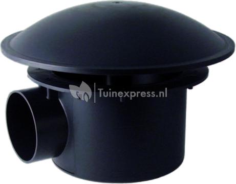 Zwarte ABS bodemafvoer met kamer en bocht. De bodemafvoer is tevens voorzien van beschermkap zodat er geen vissen in kunnen ontsnappen.