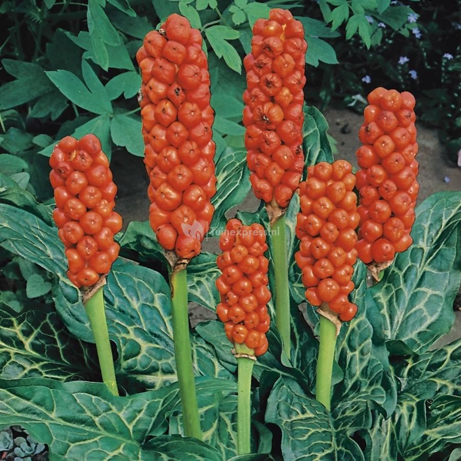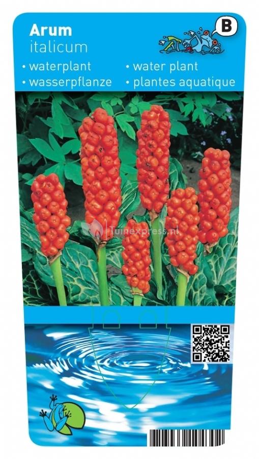 Omdat de Italiaanse aronskelk houdt van een vochtige grond is deze uitermate geschikt om aan de oever van uw vijver te plaatsen. Deze plant valt vooral op wanneer de kolf met kleine bleekgele bloemetjes veranderd in kleine vruchtjes in de vorm van (giftige) besjes. De plant bloeit in april/mei in een schutblad waarna de opvallende roodoranje besjes in juli verschijnen. Opvallend aan deze plant is dat na de bloei ook het blad verdwijnt. Alleen in het vroege voorjaar en in het najaar draagt deze plant bladeren. In de winter is er niets te zien van de Italiaanse aronskelk; overwinteren doet deze plant onder de grond. Groepsgewijs kunt u deze plant prima combineren met bijvoorbeeld varens of klimop; de prachtige kleur van de besjes steekt mooi af bij het groen van de planten.