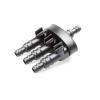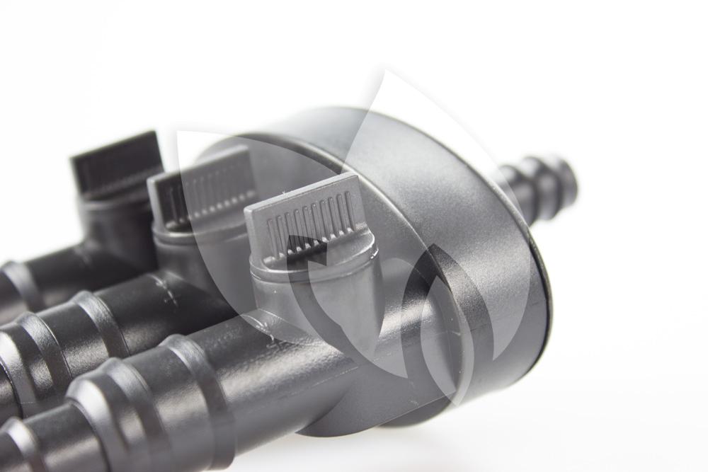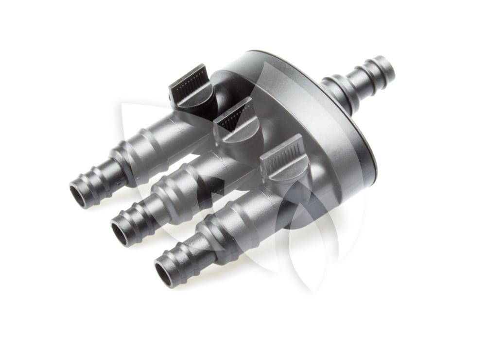 Kunststof 3-weg kraan met 13/19 mm aansluitingen. Op iedere uitgang zit een regelkraan om de doorstroming te kunnen regelen. Voor bijvoorbeeld het verbinden van vier stukken vijverslang. De waterkraan is niet geschikt in een droog opstelling