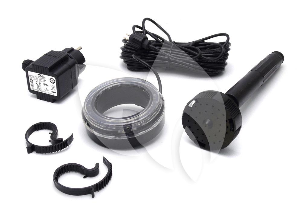 De Jet Vulcano is een sproeikop voorzien van diverse ledlampjes. De 18 verschillende ledlampjes hebben ieder een vermogen van 0,2 Watt. De lampjes voldoen aan de Europese veiligheidsrichtlijnen, zijn energiezuinig en zeer duurzaam. De telescopische verlengbuis kunt u in hoogte verstellen van 18 tot 30 cm. De sproeikop heeft een aansluiting van 1/2'' buitenschroefdraad en wordt geleverd inclusief veiligheidstransformator en een kabel met een lengte van 10 meter. Voor de sproeikop wordt de fonteinpomp Elimax 500-2500 l/h van Ubbink aangeraden, deze is niet inbegrepen.