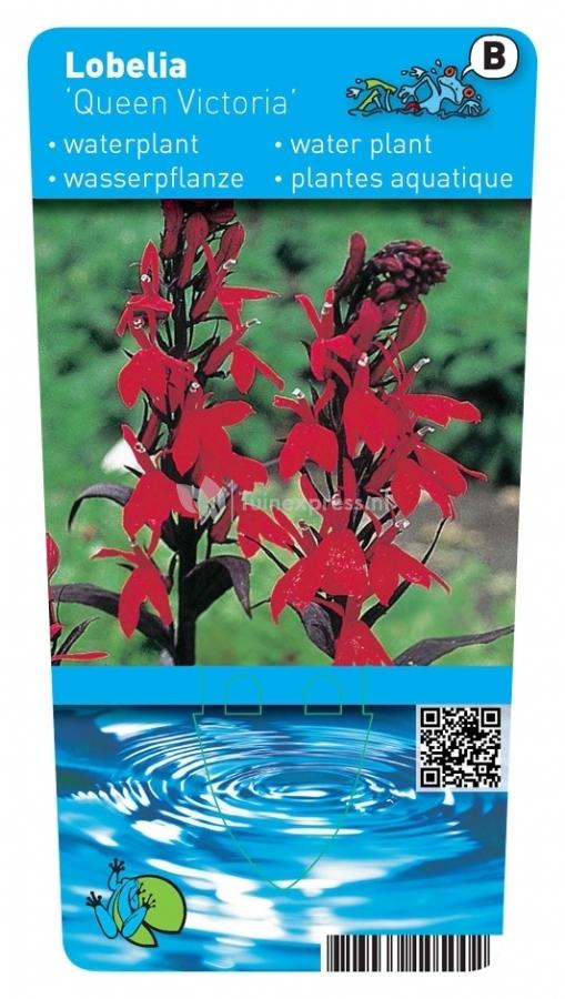 Deze lobelia soort is niet erg winterhart, er zijn zelfs bronnen die deze plant als eenjarig behandelen. Echter kan de plant een vorst hebben tot -10 graden. De wortels afdekken is dus niet onbelangrijk bij deze Queen Victoria. Laat in het zomerseizoen en vroeg in de herfst wordt deze lobelia gesierd door prachtige rode bloemen die bijna statig boven het blad uittorenen. De bloemen vallen eens zo op omdat ze een mooi contrast vormen met de roodbruine bladeren en stengels van deze lobelia. Een plant voor de echte liefhebber; hij behoeft net wat meer verzorging dan de gemiddelde andere waterplant.