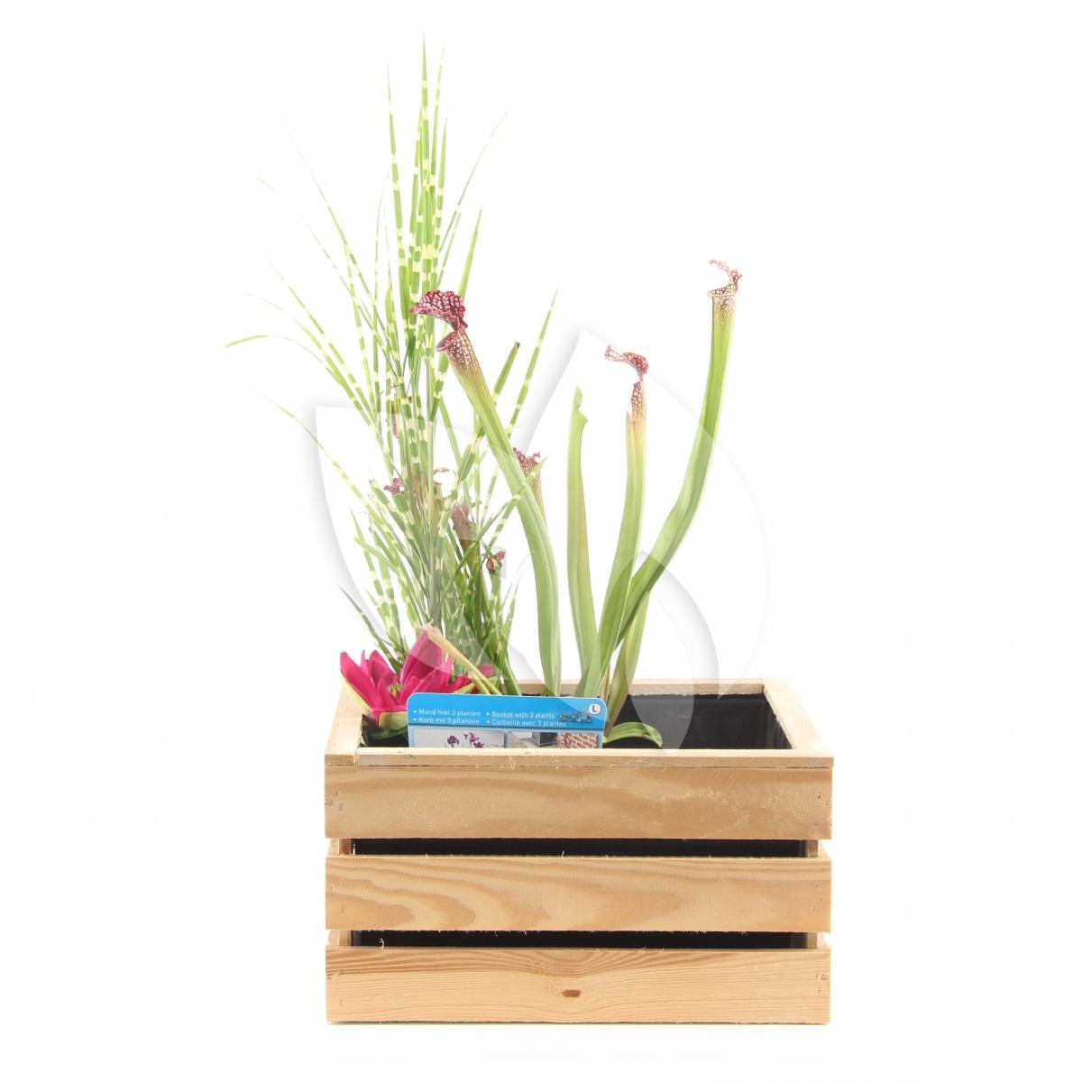 Deze mini vijver is direct klaar voor gebruik. Het enige dat u hoeft te doen is het toevoegen van water. Het houten kistje geeft een leuke twist aan de mini vijver waardoor het een speels karakter krijgt. Met deze mini vijver creëert u een sfeervol hoekje in uw tuin of op een bijzettafeltje.