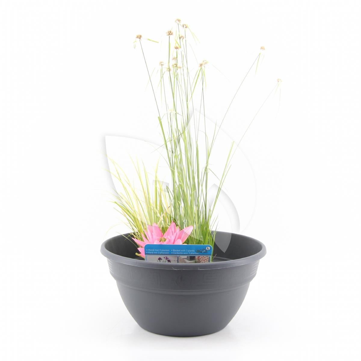 Mini vijvers zijn ideaal wanneer u graag een waterpartij in uw tuin wilt, maar hier niet de ruimte voor hebt. De vijvermand met het samengestelde plantenarrangement plaatst u in de grijze teil, u voegt water bij en het grote genieten kan beginnen. Het plantenarrangement bestaat uit 3 waterplanten die een prachtig geheel vormen in uw minivijver. De mini vijver is geschikt voor ieder terras, patio of zelfs balkon!