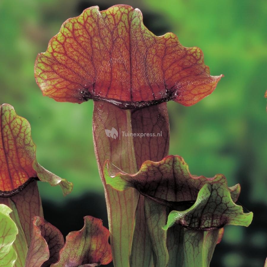 Vroeg in het voorjaar bloeit de oranjebruine trompetbekerplant met grote rode, geurende bloemen. Na bevruchting door onder andere bijen, verschijnen de kokervormige bladeren met glibberige kokerrand. Door het verteren van insecten komen vleesetende planten aan hun nitraten die ze nodig hebben op de voedselarme grond waar ze op groeien. Deze bijzondere planten staan prachtig gecombineerd met andere waterplanten in een vijvermandje.