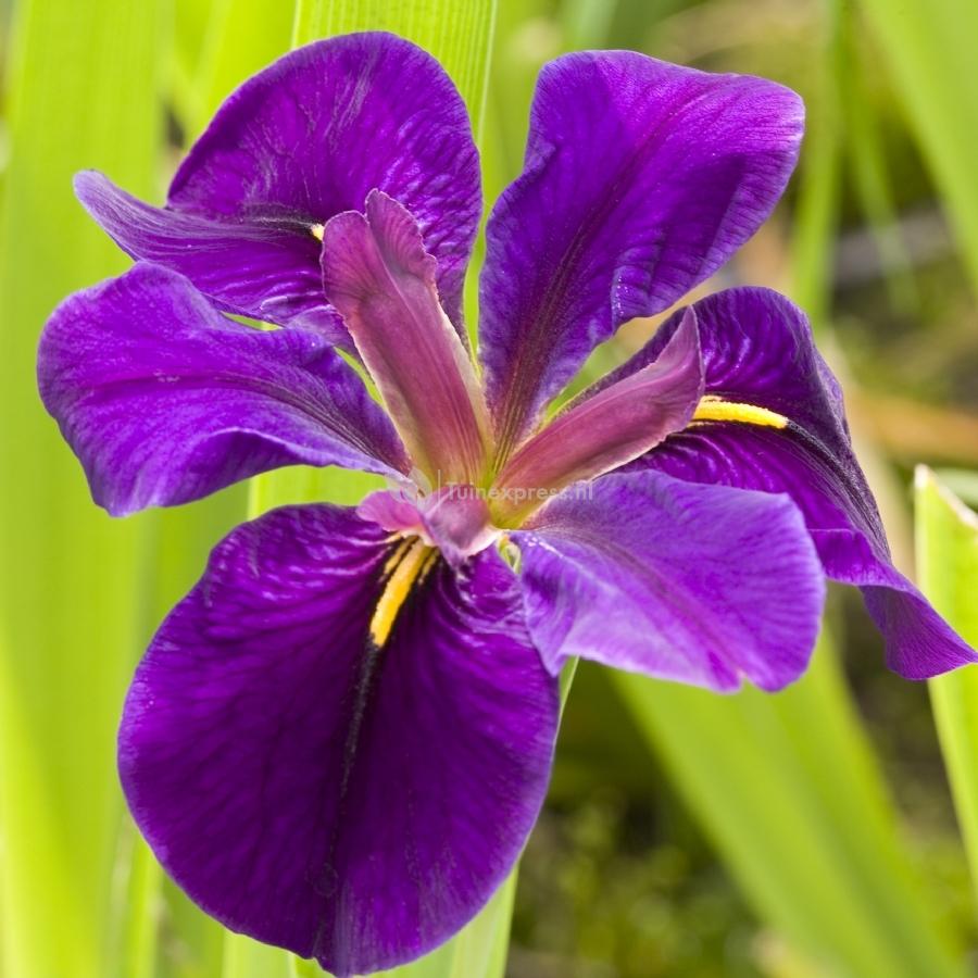 Houdt u van opvallend bloeiende planten? De paarse Japanse iris bloeit in juni en juli met prachtige dieppaarse, soms bijna zwarte bloemen met goudkleurige details. De fluweelzachte bloemen kunt u niet over het hoofd zien; ze kunnen wel 10cm groot worden! De paarse iris staat graag in ondiep water of langs de oever in vochtige grond. Deze prachtige sierplant kan 60-80cm hoog worden. Of u nu een Japanse vijver heeft, een moderne of een natuurlijke vijver, de paarse iris past in alle sferen!