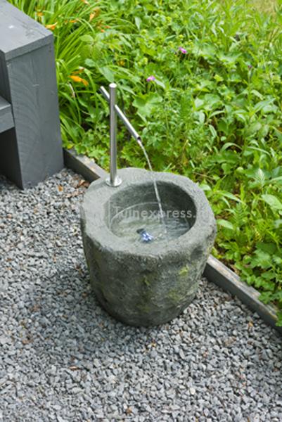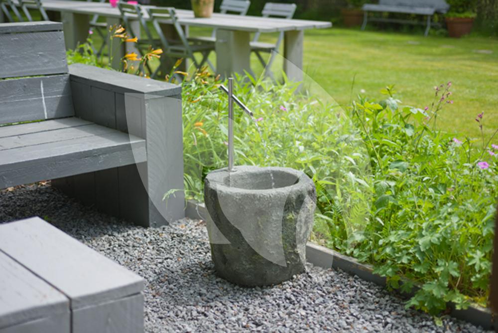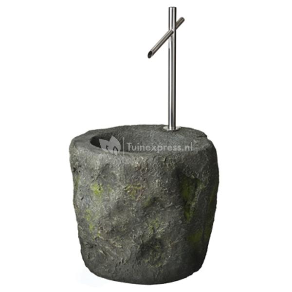 Dit bijzondere waterornament bestaat uit een gewaagde combinatie van modern versus rustiek. De polyresin bak is zo vormgegeven dat het uit een eeuwenoude kei lijkt te zijn gebeiteld. De toevoeging van een RVS -fontein geeft het waterornament vervolgens een speels karakter. Dit waterornament is de eyecatcher van een sfeervol gedecoreerd hoekje op uw terras. Door hem in een hoek van de tuin te plaatsen kun je de hoeken van een tuin mooi doorbreken zodat de tuin ook nog eens een stukje groter lijkt. Dit kun je bijvoorbeeld ook nog doen met een mooie bloempot of planten bak.