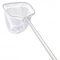 In principe kunnen we hier een onderscheid maken tussen twee verschillende schepnetten; grof- en fijnmazig. Een grofmazig schepnet heeft grotere openingen dan een fijnmazig net. Afhankelijk van wat voor vuil u wilt verwijderen kunt u keuze maken uit beide schepnetten. Een fijnmazig net is bijvoorbeeld zeer geschikt om draadalgen te verwijderen in de warme zomermaanden. Een grofmazig schepnet gebruikt u voor het verwijderen van gevallen blad in de herfst. Denkt u ook goed aan de vorm? Bij een strak vormgegeven vijver zal u fijner werken met een vierkant schepnet waardoor u ook goed in de hoeken kunt komen. Bent u in het bezit van een kleine vijver dan heeft u waarschijnlijk al voldoende aan een schepnet met vaste steel. Heeft u echter een grotere vijver dan kunt u kijken naar de schepnetten die te combineren zijn met een telescoop steel. Deze is in verschillende afmetingen verkrijgbaar waardoor er altijd wel een bij zit die voor u het best zal werken. Let goed op, bij sommige schepnetten dient u de steel naar keuze los te bestellen.